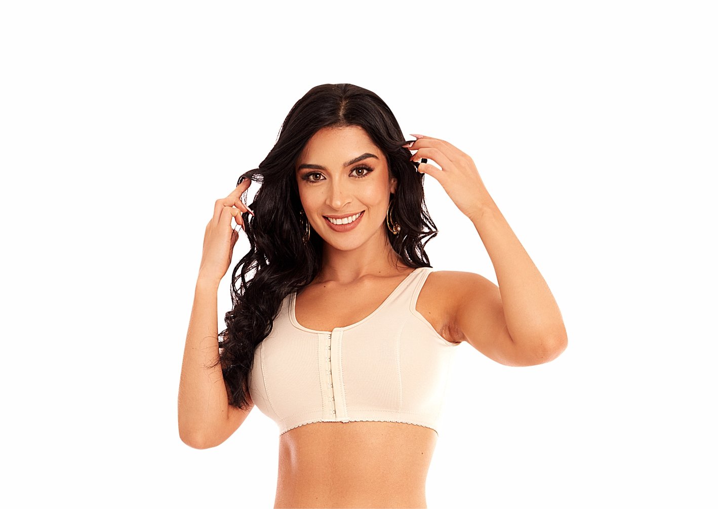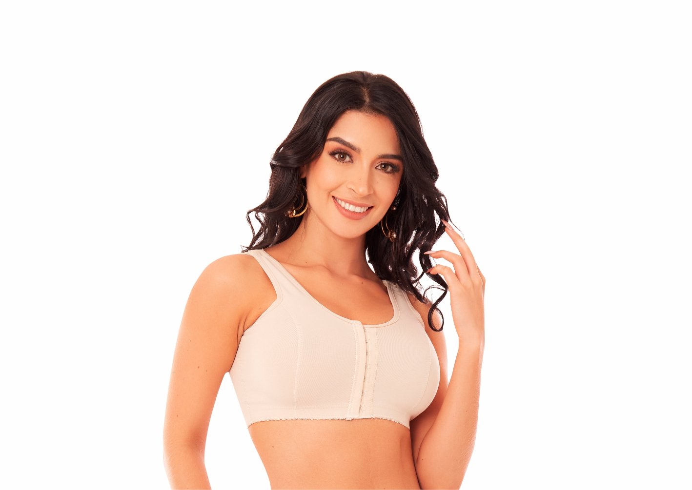 Este brasier es versátil y adecuado tanto para el uso diario como para el posoperatorio, proporcionando cobertura en la espalda, soporte y control en el busto. Disponible en color beige y en tallas desde la S hasta la XL.